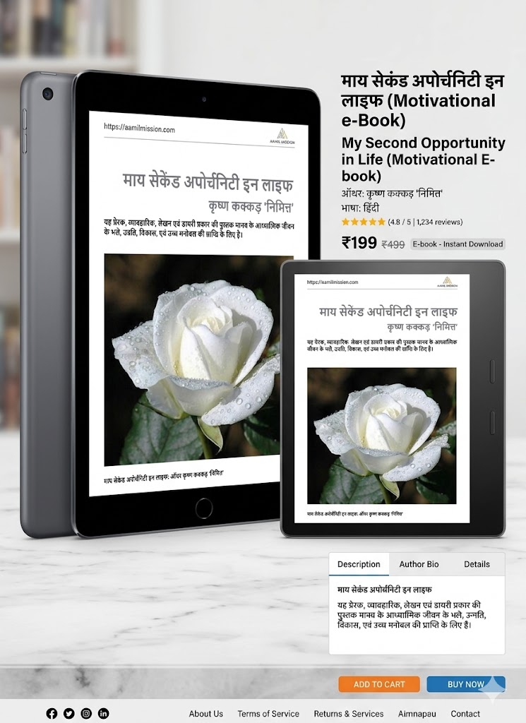 “माय सेकेंड अपोर्चनिटी इन लाइफ” एक अद्भुत प्रेरणादायक और आध्यात्मिक मार्गदर्शक पुस्तक है, जो आपके जीवन को नई दिशा देने के लिए लिखी गई है। यह केवल एक किताब नहीं, बल्कि एक डेली प्रैक्टिस डायरी है, जो आपको अपने विचारों, भावनाओं और जीवन के उद्देश्य को समझने और सुधारने में मदद करती है।
